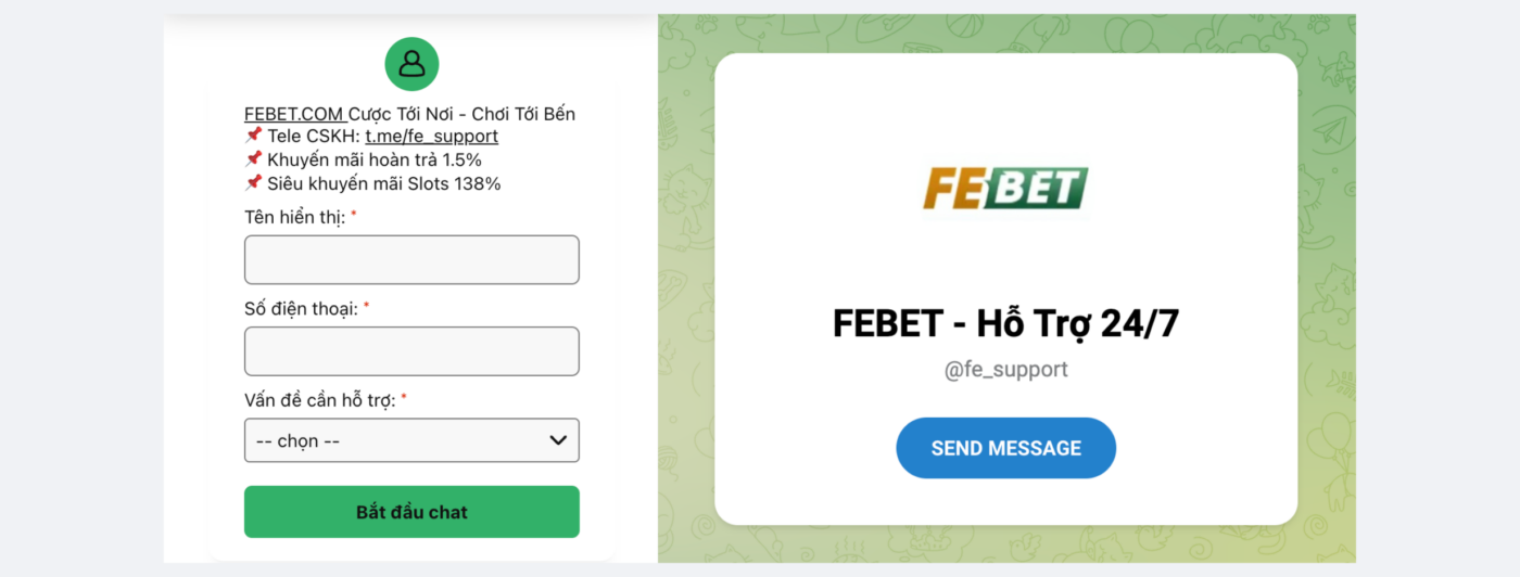 Hãy kết nối với FEBET ngay hôm nay để nhận sự hỗ trợ tận tâm và nhanh chóng nhất từ đội ngũ chuyên nghiệp của chúng tôi. Chúng tôi hoạt động 24/7 để đồng hành cùng bạn.